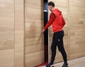 The goalkeeper of the Albanian national football team, Ertriti Berisha, exiting a conference before the match between the national team and the Italian national football team at the Air Albania stadium.