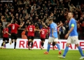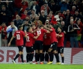 The players of the Albanian national football celebrate scoring a goal during the friendly football match Albania vs Italy, 1-3, played at the Air Albania stadium in Tirana.
