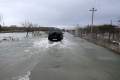 Car driving on a flooded road in the village of Kuc near the city of Shkodra. The heavy rains of the last few days in Albania have brought flooding of rivers and floods in the western areas of the country, low-lying buildings and arable lands.