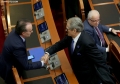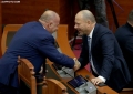 MP Zef Hila dhe Oerd Bylykbashi speaking during a parliamentary session, in which one normative act regarding PFIZER vaccines was approved and the two new MPs, Petrit Doda and Orjela Nebiaj, were sworn in. The latter replaced Alfred Rushaj and Grida Duma, who gave up from their mandate.