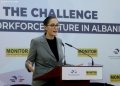 Gent Gazheli during a conference regarding the future of the workforce and the departure of her from Albania. The conference was organized by Monitor Magazine and the American Chamber of Commerce.