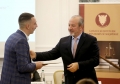 Head of the Constitutional Court Vitore Tusha and one of the winners of the competition Ardit Sulaj during a meeting held in the framework of a competition organized by the OSCE in the field of law. The competition held had as its subject the drafting of an individual constitutional complaint and was held in several universities in Albania.