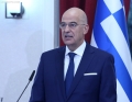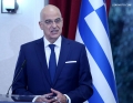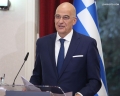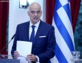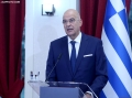 Greek Foreign Minister Nikos Dendias speaking during a joint press conference with the Minister for Europe and Foreign Affairs, Olta Xhacka. Throughout conference, the ministers spoke about the issue of the sea, the intensification of relations between the two countries, the energy crisis and the war in Ukraine.