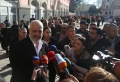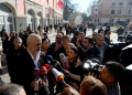Prime Minister Edi Rama, surrounded by police forces speaking to the media after the presentation ceremony for the project of the new national theater, which was also attended by the mayor of Tirana, Erion Veliaj. The new theater, designed by the Danish architect Bjarke Ingels, will be built in the place where the old theater stood. The destruction of the theater and the project have met with protests and resistance from artists and citizens.