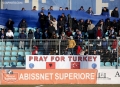 A banner in honor of victims of earthquake in Turkey, during football match, Erzeni of Shijak vs Teuta of Durres, 1-1, valid for the Albanian Super League, played at the Niko Dovana stadium in Durres.