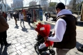 A man walking with a bouquet of flowers walking on a street in Tirana, decorated on the occasion of Valentine's Day.