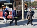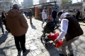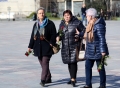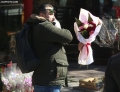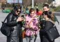 Women with flowers in their hands in the Skanderbeg square in Tirana, decorated on the occasion of Valentine's Day.
