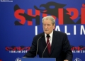 The Chairman of the Democratic Party, Sali Berisha speaking during a press conference at the blue headquarters. He emphasized the importance of February 20, 1991, when the bust of former dictator Enver Hoxha was brought down, adding that the message of that day is still relevant today.