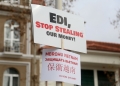 Citizens with signs in their hands during a protest in front of the parliament. In the protest called by Berisha, who along with 14 other MPs of the democratic party have been expelled from the parliament, appeals were made to the Appeals court regarding the case of the logo and seal of the Democratic Party. During the protest, Berisha said that if the verdict was not in favor of his group, he and the protesters would march towards the house of Prime Minister Edi Rama.