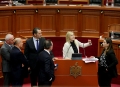MPs Isuf Celaj and Agron Gjekmarkaj speaking during a parliamentary session where there were debates between the majority and opposition MPs regarding the absence of Prime Minister Edi Rama. The opposition MPs accused the Speaker of the Parliament, Lindita Nikolla, of constantly breaking the rules, while they demanded to talk about the McGonigal issue, despite the fact that Prime Minister Edi Rama has been on an official visit to Japan for several days.