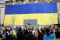 Citizens with banners and Ukrainian flags during a solidarity march with the Ukrainian people on the 1st anniversary of the Russian aggression in Ukraine.