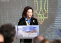 The Ambassador of the United States of America in Tirana, Yuri Kim speaking before a solidarity march with the Ukrainian people on the 1st anniversary of the Russian aggression in Ukraine.