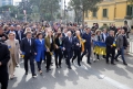 MP Klotilda Bushka, Minister of Defense, Niko Peleshi, Minister of State for Relations with Parliament, Elisa Spiropali, Mayor of Tirana, Erion Veliaj, Head of the EU Delegation in Tirana, Ambassador Christiane Hohmann, Ambassador of Ukraine in Tirana, Volodymyr Shukrov, the Ambassador of the United States in Tirana, Yuri Kim and MP Mimi Kodheli during a solidarity march with the Ukrainian people on the 1st anniversary of the Russian aggression in Ukraine.