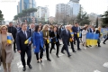 Head of the EU Delegation in Tirana, Ambassador Christiane Hohmann, Ambassador of Ukraine in Tirana, Volodymyr Shukrov, the Ambassador of the United States in Tirana, Yuri Kimduring a solidarity march with the Ukrainian people on the 1st anniversary of the Russian aggression in Ukraine.