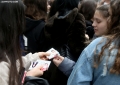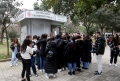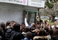 STUDENTS WAITING IN LINE FOR PASSES - Students waiting in line at a counter to receive monthly student passes for city bus lines in Tirana. Students have complained that by being forced to be present themselves to get the passes, they lose classes.