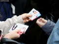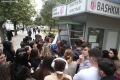 Students waiting in line at a counter to receive monthly student passes for city bus lines in Tirana. Students have complained that by being forced to be present themselves to get the passes, they lose classes.