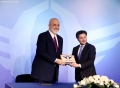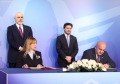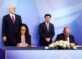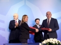 Prime Minister Edi Rama, his counterpart Dritan Abazovic, the Minister of Agriculture and Rural Development, Frida Krifca and the Minister of Agriculture, Forestry and Water Resources of Montenegro, Vladimir Jokovic during the ceremony of signing the agreements between Albania and Montenegro after a meeting of both governments. The two ministers signed a cooperation agreement in the fields of maintenance and joint management of fishing in the Shkodra lake and the Bune river.