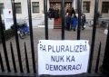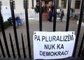 The banner with the text No pluralism, no democracy placed on the railing while the legal representatives of the groups within the democratic party wait in front of the Court of Appeal of Tirana. The court is expected to decide on the ownership of the seal and logo of the Democratic Party, after the verdict of the first instance, by judge Agron Zhukri, was appealed by the Alibeaj group.