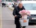 MARCH 8 IN TIRANA - A man with a bouquet in a bicycle basket on a street in Tirana on March 8, International Women's Day.