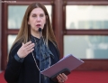 Minister of Education and Sports, Evis Kushi speaking at a press conference in front of the Prime Minister's office, after a meeting of government, regarding the approved decisions