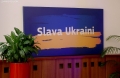The sign Slava Ukraini (Glory of Ukraine) during a charity evening at the Embassy of Ukraine in Tirana to collect funds to help those affected by Russian aggression in Ukraine. During the evening, a ball signed by former footballer Andreiy Shevchenko and boxing gloves signed by the Klitschko brothers.