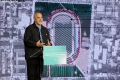 President of the AFF Armand Duka speaking during a ceremony held in the framework of the international competition for the new stadium of the city of Durres. The winner was the Belgian company 51N4E, which will design the stadium as a modern complex which will have training fields, basketball courts and swimming pools. The Belgian studio 51N4E, which won against studios Bjarke Ingels Group, BIG (Denmark) and MVRDV (Holland), is the same studio that designed Skanderbeg Square.