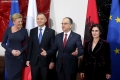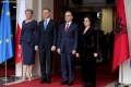 Polish President Andrzaj Duda and his wife Agata Kornhauser-Duda and Albanian President Bajram Begaj and his wife Amarda Baegaj posing in front of the entrance of the Presidency during a visit of Duda to Tirana.