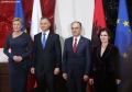 Polish President Andrzaj Duda and his wife Agata Kornhauser-Duda and Albanian President Bajram Begaj and his wife Amarda Baegaj posing inside the premises of the Presidency during Duda's visit to Tirana.