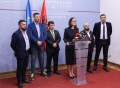 The Minister of Finance and Economy, Delina Ibrahimaj, Filip Gjoka of Filip & Co and the Head of Albanian Exports, Alban Zusi during a press conference after a meeting between the Minister and the Governor of the Bank of Albania, Gent Sejko with representatives of Albanian businesses. During the conference, Ibrahimaj announced some measures that the ministry will take to help exporting businesses in Albania, which have been affected by the movements of the exchange rate in the country during the last months.