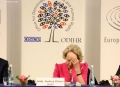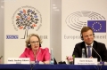 The head of the ODIHR mission for the local elections in Albania, Audrey Glover and the member of the European parliament, Sven Simon speaking during a press conference. Glover spoke about the campaign, which he described as quiet, but very focused on political leaders, while she commented on the problems related to electronic voting.