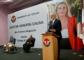 Federica Mogherini speaking during a ceremony where she was decorated with the title Doctor Honoris Causa from the Tirana Universitety, in recognition of everything she has done for Albania. During the ceremony, Mogherini was described as a friend of Albania, considering her as one of the few European figures who have seen her work for Albania as more than that.