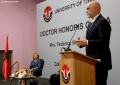 Rector of the University of Tirana, Artan Hoxha speaking during a ceremony where Federica Mogherini was decorated with the title Doctor Honoris Causa from the Tirana Universitety, in recognition of everything she has done for Albania. During the ceremony, Mogherini was described as a friend of Albania, considering her as one of the few European figures who have seen her work for Albania as more than that.