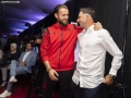 The player of the Albanian national football team, Sokol Cikalleshi and former player Ansi Agolli during a promotion ceremony for Ansi Agolli's documentary Historia Ime at the FSF premises, produced by journalists Elvis Rexha and Glenti Nallbani. The documentary shows his career and his personal story.