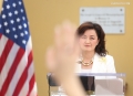 Ambassador of the United States in Tirana, Yuri Kim entering a press conference in the premises of the American embassy in Tirana. This was Yuri Kim's last press conference as ambassador to Albania, while she will continue to work within the American administration, taking the position of principal deputy assistant secretary for European affairs at the US State Department.