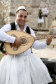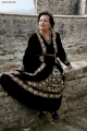 Singer of a folk ensemble dressed in traditional costumes in the Castle of Gjirokastra before the start of the Gjirokastra Folk Festival. The festival will be held for 8 nights in the castle, on a stage open to all.
