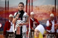 Presenter Vilma Masha speaking in the Gjirokastra Castle during the Gjirokastra Folk Festival. The festival will be held for 8 nights in the castle, on a stage open to all.