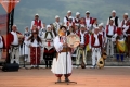 Singers and dancers of folklore ensembles, dressed in traditional costumes, performing in the Gjirokastra Castle during the Gjirokastra Folk Festival. The festival will be held for 8 nights in the castle, on a stage open to all.