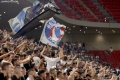 Tirana fans sing and wave flags during the football match, Tirana vs Dinamo Batumi, 1-1, valid for the first round of the qualifiers for the UEFA Conference League group stage.