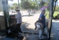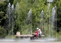 A man with a child in a stroller cool off in the fountains of Skenderbej Square, as a result of the high temperatures, July 18, 2023. Albania has been engulfed in a heatwave and drought that has scorched Europe, with temperatures well above 40 degrees Celsius.