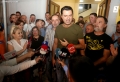Gjergji Hani, Enkelejd Alibeaj, Lulzim Basha speaking for journalists after his victory in the elections of July 29 in front of the new headquarters of the democratic party. After winning the race against the candidate Gjergji Hani, Basha said that he will try to unite the party and seek his own in politics.