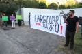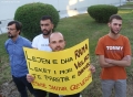 Members of the Bashke Movement hold a banner before the Tirana Municipality during a protest against the Tirana Mount project, whose works have begun behind the Palace of Culture. Members of the movement, as well as other citizens, have expressed their opposition to the destruction of the park.