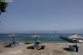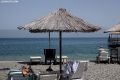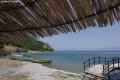 Boats and parasols on the shore of Lake Ohrid, near the village of Lin in Pogradec. Many tourists are directed to the coast and mountains of Albania to escape the new heat wave that has engulfed the country.