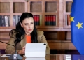 Deputy Prime Minister and Minister of Infrastructure and Energy, Belinda Balluku, speaks during a joint press conference with Albania's Prime Minister Edi Rama, where they shared with the public the latest data he received from the inspection of oil exploration wells of the SHELL company in Shpirag. Rama declared that the quality of the oil found is of a high quality and that this important discovery will have a historical impact on the economic and social development, as well as on the geopolitical and geostrategic position of Albania.