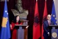 The President of the Republic of Albania, Bajram Begaj, and his Kosovar counterpart, Vjosa Osmani, speaking during a joint press conference in the premises of the Presidency. The two Presidents have spoken about the cooperation between the two countries and that there should be more coordination.