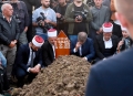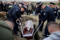 Police officer lowering the coffin of officer Afrim Bunjaku during the burial ceremony, in the village of Samadrexhe in Vushtrri. Bunjaku was killed in the line of duty in the village of Bajnske in Zvecan, north of Kosovo.