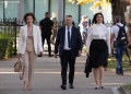 MPs Nasip Naco and Blerina Gjylameti entering a parliamentary session. During the session, a minute's silence was held for the Kosovar officer Afrim Bunjaku, who was killed in the line of duty in the village of Banjska in Zvecan, north of Kosovo.