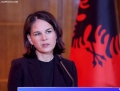 Minister of Foreign Affairs of the Federal Republic of Germany, Annalena Baerbock speaking during a joint press conference after a meeting of the Foreign Ministers of the EU and those of the Western Balkans in Tirana, in the framework of the Berlin Process. This meeting precedes the Berlin Process Summit that will be held in Tirana on October 16, 2023. The second session of the meeting and the family photo was boycotted by Serbian Foreign Minister Ivica Dacic after debates with German Minister Baerbock regarding the events in Kosovo.