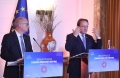 The Minister for Europe and Foreign Affairs, Igli Hasani and the European Commissioner for Neighborhood and Enlargement, Oliver Varhelyi speaking during a joint press conference after a meeting of the Foreign Ministers of the EU and those of the Western Balkans in Tirana, in the framework of the Berlin Process. This meeting precedes the Berlin Process Summit that will be held in Tirana on October 16, 2023. The second session of the meeting and the family photo was boycotted by Serbian Foreign Minister Ivica Dacic after debates with German Minister Baerbock regarding the events in Kosovo.