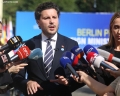 Prime Minister of Montenegro and Acting Minister for Foreign Affairs, Dritan Abazovic speaking to the journalists after a meeting of the Foreign Ministers of the EU and those of the Western Balkans in Tirana, in the framework of the Berlin Process. This meeting precedes the Berlin Process Summit that will be held in Tirana on October 16, 2023. The second session of the meeting and the family photo was boycotted by Serbian Foreign Minister Ivica Dacic after debates with German Minister Baerbock regarding the events in Kosovo.