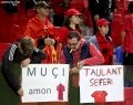 Fans hold signs during the friendly football match, Albania vs Bulgaria, 2-0, played at the Air Albania stadium in Tirana.